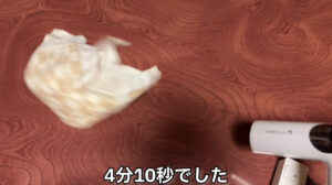 「え、本当にそんなに早いの?」と時計を二度見してしまいました。他のドライヤーだと5〜7分かかることもあるので、この4分台はかなり優秀です。